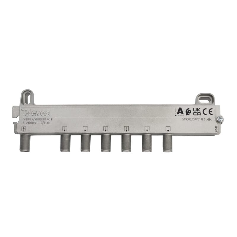 Jaotin kuuteen, 5-2400MHz, 11-12dB, DC-läpisyöttö kaikista Televes antennijaotin kuuteen (5-2400MHz, 11-12dB) F-liittimillä.