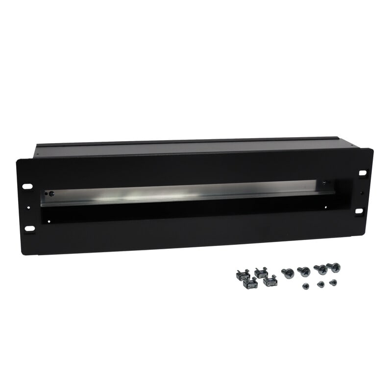 19\" räkkikaappiin asennettava kotelo DIN-kiskokomponenteille. Saat sijoitettua kaikki DIN-kiinnitysjärjestelmällä varustetut oheislaitteet samaan paikkaan, hyvään järjestykseen.