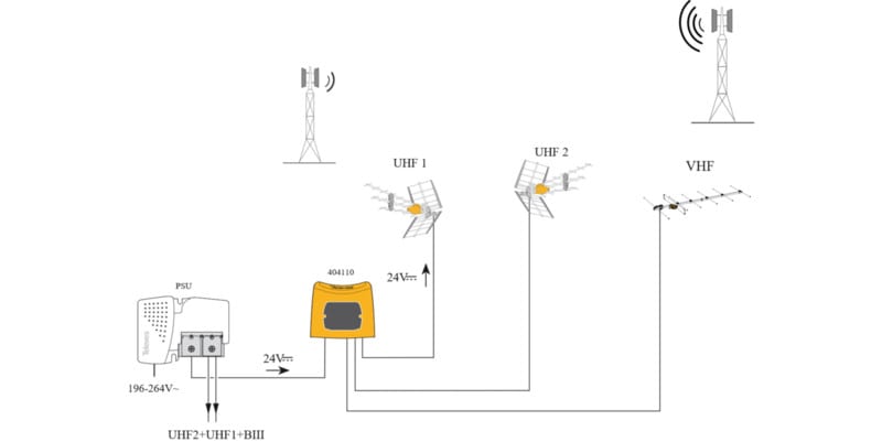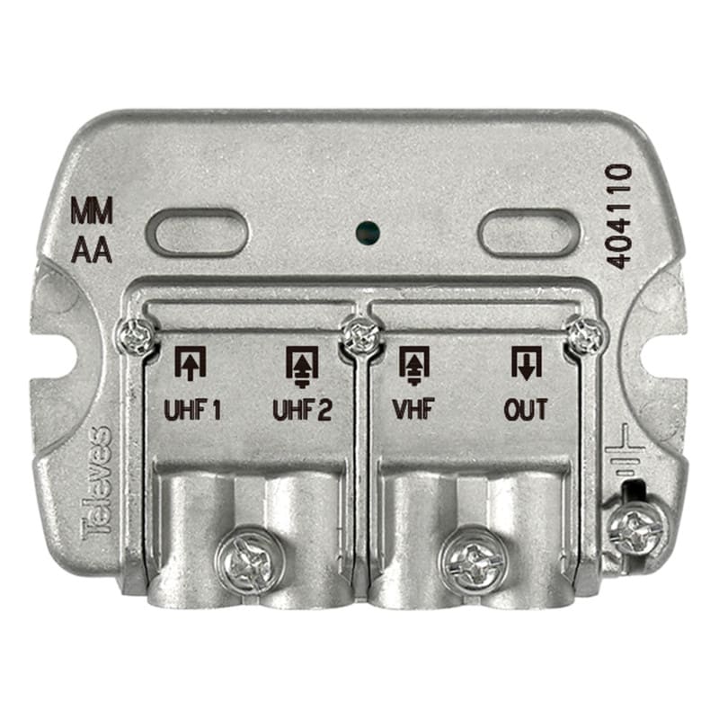 Televes mastosuodin, jolla voidaan yhdistää eri antenneilta tulevat signaalit yhteen kaapeliin ennen kiinteistön jakopistettä.