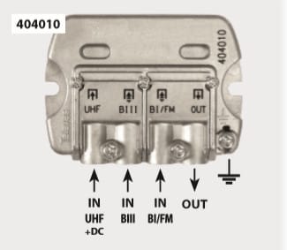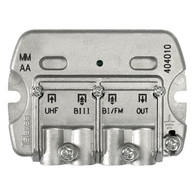 Televes mastosuodin, jolla voidaan yhdistää eri antenneilta tulevien signaalit yhteen kaapeliin ennen kiinteistön jakopistettä.