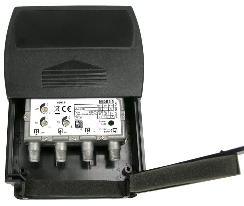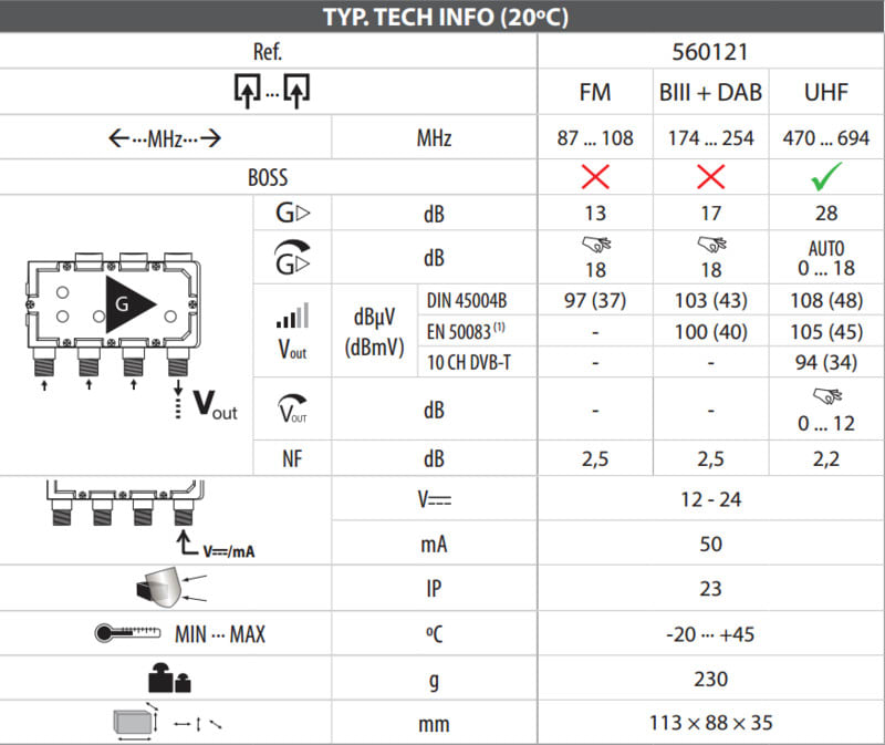 - UHF vahvistus 10-28 dB, 470…694MHz, kohinaluku 2,2dB