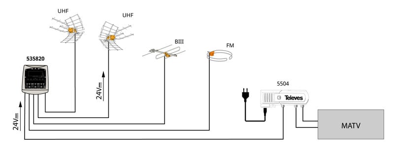 - Käyttöjännite 24 VDC syötetään koaksiaalikaapelin kautta vahvistimelle. Ei sisällä verkkolaitetta. Tilattava erikseen, esim. T5795 tai T5504.