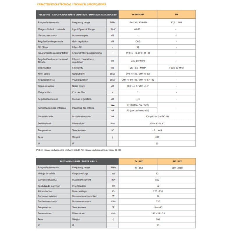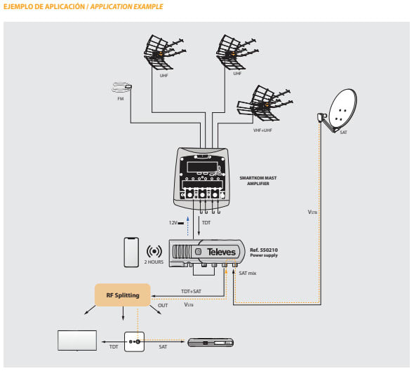 3 tuloa DVB-T ja DVB-T2 signaalien vahvistamiseen (VHF + UHF), joissa jokainen kanavanippu voidaan suodattaa ja vahvistaa erikseen ohjelmoitavalla suotimella. Lisäksi vahvistimessa on yksi passiivinen FM-tulo.