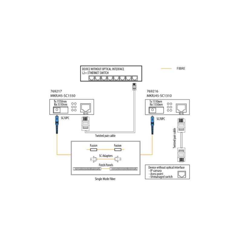 Televes T769217 optinen mediamuunnin mahdollistaa datan siirron yksimuotokuitujen (SM) kautta. Laite vastaanottaa 10/100/1000Base-TX -signaaleja RJ45-liittimen kautta, muuntaa nämä signaalit 1000Base-FX -muotoon ja siirtää ne yksimuotokuitukaapelilla, jossa on SC/UPC-liitin.