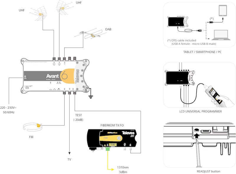 Televesin Avant6 on ohjelmoitava päävahvistin antenniverkon kohteisiin. Käyttökohteina pari- ja rivitalot, pienemmät kerrostalot sekä julkiset kohteet, kuten koulut ja virastot. Yhteensopiva DVB-T ja DVB-T2 signaalien kanssa. Voit ohjelmoida vahvistimeen 20 kanavaa ja säätää kaikkien kanavien tasot erikseen.