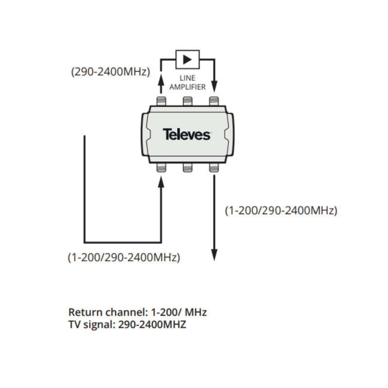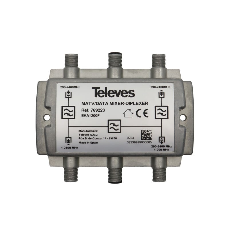 CoaxData G.hn diplekserisuodin 1-200 MHz / 290-2400 MHz, 4*porttia Tämä diplekserisuodin mahdollistaa eri taajuuskaistojen suodattamisen asennuksissa, joissa käytetään perinteisiä TV- ja dataverkkoja. Näin voidaan varmistaa signaalin hyvä laatu. T769223 koostuu alipäästösuotimesta, joka päästää läpi 1–200 MHz:n taajuusalueen datasignaalit, ja kahdesta ylipäästösuotimesta, jotka suodattaa SMATV-signaalit 290–2400 MHz:n taajuusalueella. Suotimessa on tehokas erotusvaimennus kaistojen välillä ja erittäin pieni läpimenovaimennus.