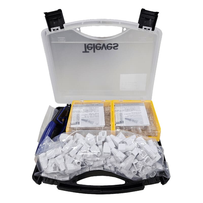 Televesin dataliitinpakkaus kätevässä kuljetuslaatikossa. Pakkaus sisältää: