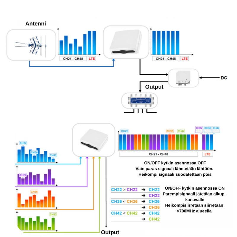 Halutaessa toisen tulon heikompi kanava voidaan siirtää alueelle 694-862MHz vaihtamalla ON/OFF kytkin asentoon ON.