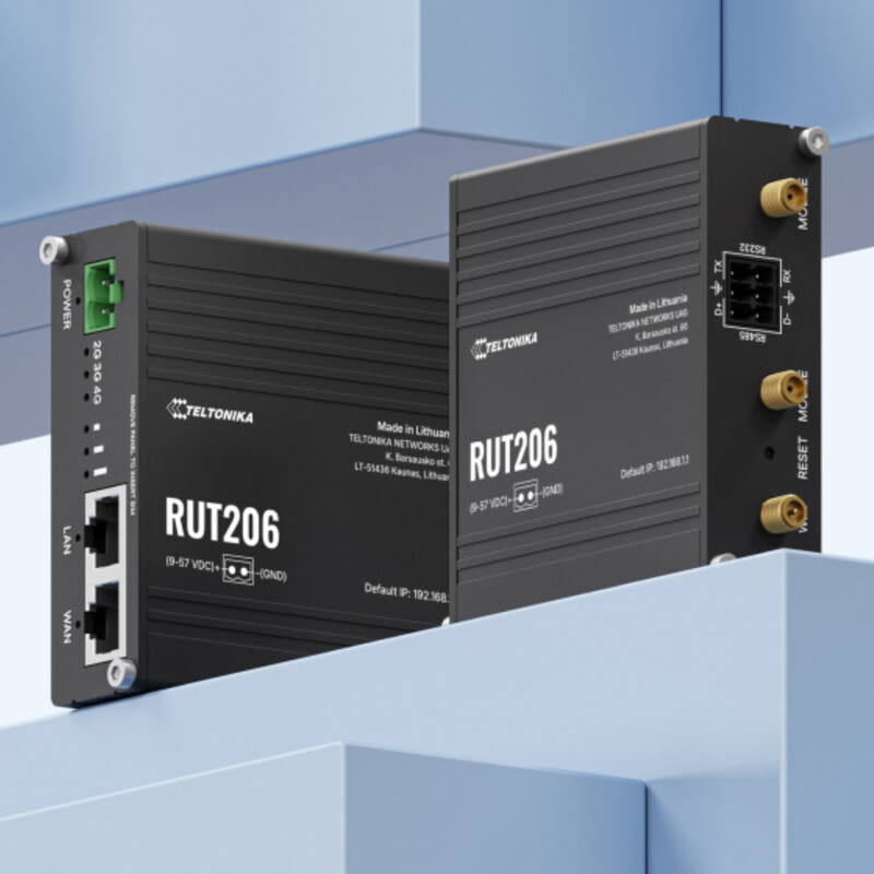 Tehokas ja kompakti Teltonika RUT206 tarjoaa 4G LTE (Cat 4), Wi‑Fi‑tuen ja kaksi Ethernet‑porttia, sekä Dual SIM-varmistuksen, RS232/RS485-sarjaliitännät, micro‑SD-tuen ja joustavan PoE-in-tuen.