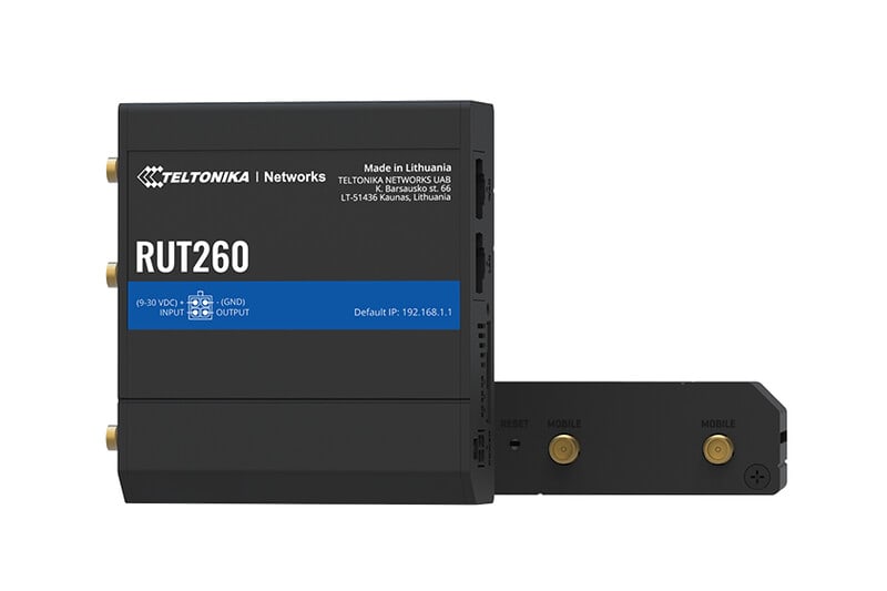 Teltonika RUT260 on pieni mutta tehokas teollisuusluokan 4G/LTE-reititin, joka tarjoaa jopa 300 Mbps mobiilinopeuden (LTE Cat 6).