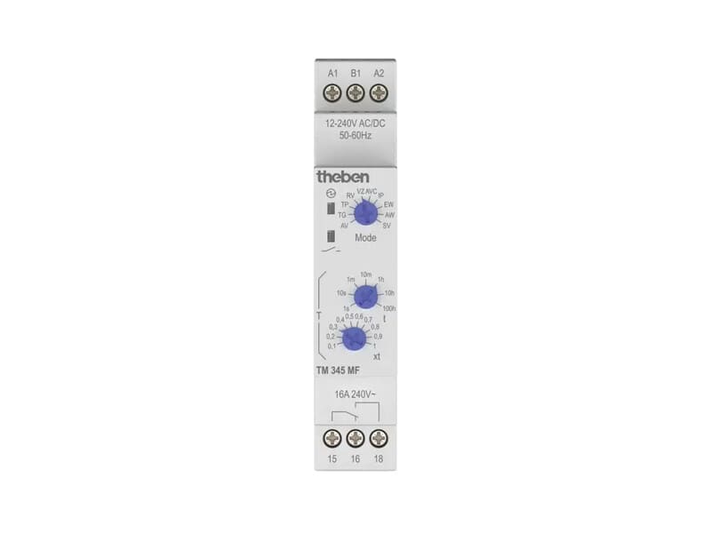 Elektroninen monitoimiaikarele Elektroninen aikarele, Lukittuva kiertokytkin aika-alueen valintaan sekä seuraaville käyttötavoille:, Havahtumisviive (AV), ilman ohjauskosketinta, Vetohipaisu (EW), ilman ohjauskosketinta, Päästöhidastus (RV), ohjauskoskettimella, Pulssinmuodostin (IF), ohjauskoskettimella, Päälle-/poiskytkentäviive (VZ), ohjauskoskettimella, Veto-/päästöhipaisu (WR), ohjauskoskettimella, Pulssigeneraattori (TG), ilman ohjauskosketinta, Yleiskäyttöinen, koneiden, valaistuksen, ilmastoinnin, lämmityksen, kaappien jne. automaattisten toimintojen ohjaukseen, Tarkka analoginen aika-asetus, Monijännitetulo kaikille syöttö- ja ohjausjännitteille, ei tarvita kytkentäjohtoja tai lisäliittimiä, LED-valo kytkentätilan näyttöön