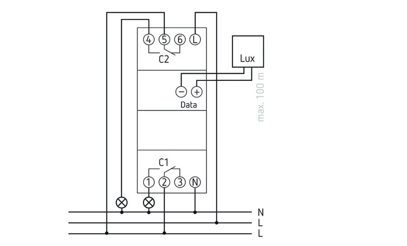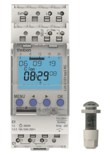 Hämäräkytkin sisäänrakennetulla viikkoajastimella, Ulkoinen valoisuusanturi sisältyy toimitukseen, 1 kanava, Sisäänrakennettu viikkoajastin, Erilaiset luksiarvot voidaan ohjelmoida, eri viikonpäiville, Kiinteät PÄÄLLÄ- ja POIS-ajat (esim. yökatkaisulle), Ohjelmoitavissa valoisuudesta riippumatta, 2 erikoisohjelmaa vuositoiminnolla, (esim. 24.12.2007 - 6.1.2008): Jokaiselle erikoisohjelmalle voidaan ohjelmoida erilaiset luksiarvot ja erilaiset kytkentäajat, DCF77 radio-ohjattu ulkoisen antennin avulla, Loma- ja vapaapäiväohjelma vuositoiminnolla kiinteille vapaapäiville ja pääsiäiseen sidotuille juhlapyhille, Erilaiset kesä-/talviaikasäännöt valittavissa tai vapaasti määritettävissä, Kytkentävaloisuus asetettavissa digitaalisesti, Säädettävä päälle- ja päältäkytkemisviive, salamien, autojen valojen jne. aiheuttamien virhekytkentöjen välttämiseksi, esiasetus 1 minuutti, Kytkentävaloisuus ja -viive voidaan asettaa päälle- ja poiskytkennälle erikseen, Kanava- ja kytkentätilan näyttö sekä ajankohdan luksiarvon näyttö, DuoFix-jousiliittimet, 2 johtimelle liitintä kohden, Nollapistekytkentä relekoskettimien suojaamiseen ja valaisimien käyttöiän pidentämiseen (ei 24 V laitteilla), Voidaan liittää maks. 4 anturia, Yhteen digitaaliseen anturiin voidaan liittää maks. 10 laitetta, Liitäntä OBELISK top2 -muistikortille (PC-ohjelmointi), 2. kytkentäohjelma muistikortilta, Ohjelmien kopiointi, Ohjelman varmuuskopiointi, Valoisuusanturi sisältyy toimitukseen, Laajennettu valoisuusalue, Jatkuvan toiminnan kytkentä PÄÄLLÄ/POIS, Testitoiminto, (Jatkuvasti PÄÄLLÄ) asennuksen tarkastamiseen asetetusta valoisuusarvosta riippumatta, Kytkennän esivalinta, Näytön valaistus, (voidaan ottaa pois käytöstä), PIN-koodaus, Ulkoinen ohjaustulo, kytkimelle tai painikkeelle, Käyttötuntilaskurit, muistitoiminnolla