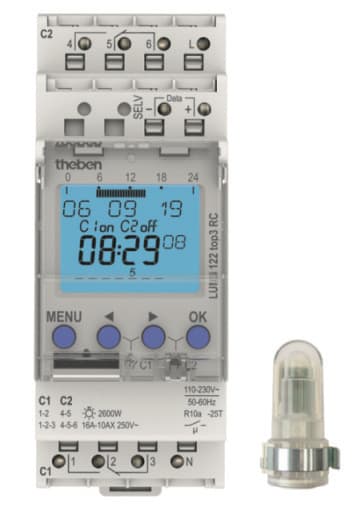 Hämäräkytkin sisäänrakennetulla viikkoajastimella, Ulkoinen valoisuusanturi sisältyy toimitukseen, Erilaiset luksiarvot voidaan ohjelmoida, eri viikonpäiville, Kiinteät PÄÄLLÄ- ja POIS-ajat (esim. yökatkaisulle), Ohjelmoitavissa valoisuudesta riippumatta, 2 erikoisohjelmaa vuositoiminnolla, (esim. 24.12.2007 - 6.1.2008): Jokaiselle erikoisohjelmalle voidaan ohjelmoida erilaiset luksiarvot ja erilaiset kytkentäajat, DCF77 radio-ohjattu ulkoisen antennin avulla, 2 kanavaa, Loma- ja vapaapäiväohjelma vuositoiminnolla, kiinteille vapaapäiville ja pääsiäiseen sidotuille pyhäpäiville, Erilaiset kesä-/talviaikasäännöt valittavissa tai vapaasti määritettävissä, Kanavasidonnainen käyttötuntilaskuri, Kaksi ulkoista ohjaustuloa, Kytkentävaloisuus asetettavissa digitaalisesti, Säädettävä päälle- ja päältäkytkemisviive, salamien, autojen valojen jne. aiheuttamien virhekytkentöjen välttämiseksi, esiasetus 1 minuutti, Kytkentävaloisuus ja -viive voidaan asettaa päälle- ja poiskytkennälle erikseen, Kanava- ja kytkentätilan näyttö sekä ajankohdan luksiarvon näyttö, DuoFix-jousiliittimet, 2 johtimelle liitintä kohden, Nollapistekytkentä relekoskettimien suojaamiseen ja valaisimien käyttöiän pidentämiseen (ei 24 V laitteilla), Voidaan liittää maks. 4 anturia, Yhteen digitaaliseen anturiin voidaan liittää maks. 10 laitetta, Liitäntä OBELISK top2 -muistikortille (PC-ohjelmointi), 2. kytkentäohjelma muistikortilta, Ohjelmien kopiointi, Ohjelman varmuuskopiointi, Valoisuusanturi sisältyy toimitukseen, Laajennettu valoisuusalue, Jatkuvan toiminnan kytkentä PÄÄLLÄ/POIS, Testitoiminto, (Jatkuvasti PÄÄLLÄ) asennuksen tarkastamiseen asetetusta valoisuusarvosta riippumatta, Kytkennän esivalinta, Näytön valaistus, (voidaan ottaa pois käytöstä), PIN-koodaus, Ulkoinen ohjaustulo, kytkimelle tai painikkeelle, Käyttötuntilaskurit, muistitoiminnolla
