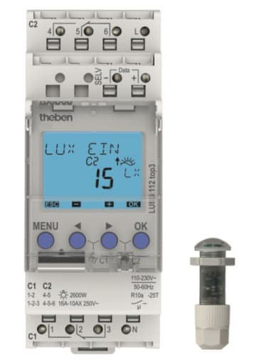 Hämäräkytkin/valonsäädin, Ulkoinen valoisuusanturi sisältyy toimitukseen, 2 kanavaa, Kaksi ulkoista ohjaustuloa, Kanavasidonnainen käyttötuntilaskuri, Kytkentävaloisuus asetettavissa digitaalisesti, Säädettävä päälle- ja päältäkytkemisviive, salamien, autojen valojen jne. aiheuttamien virhekytkentöjen välttämiseksi, esiasetus 1 minuutti, Kytkentävaloisuus ja -viive voidaan asettaa päälle- ja poiskytkennälle erikseen, Kanava- ja kytkentätilan näyttö sekä ajankohdan luksiarvon näyttö, DuoFix-jousiliittimet, 2 johtimelle liitintä kohden, Nollapistekytkentä relekoskettimien suojaamiseen ja valaisimien käyttöiän pidentämiseen (ei 24 V laitteilla), Voidaan liittää maks. 4 anturia, Yhteen digitaaliseen anturiin voidaan liittää maks. 10 laitetta, Liitäntä OBELISK top2 -muistikortille (PC-ohjelmointi), 2. kytkentäohjelma muistikortilta, Ohjelmien kopiointi, Ohjelman varmuuskopiointi, Valoisuusanturi sisältyy toimitukseen, Laajennettu valoisuusalue, Jatkuvan toiminnan kytkentä PÄÄLLÄ/POIS, Testitoiminto, (Jatkuvasti PÄÄLLÄ) asennuksen tarkastamiseen asetetusta valoisuusarvosta riippumatta, Kytkennän esivalinta, Näytön valaistus, (voidaan ottaa pois käytöstä), PIN-koodaus, Ulkoinen ohjaustulo, kytkimelle tai painikkeelle, Käyttötuntilaskurit, muistitoiminnolla