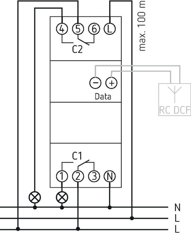 Astro-kellokytkin viikko-ohjelmalla Ajan synkronointi ulkoisen DCF- tai GPS-antennin liitännän kautta, GPS:n kanssa lisäksi paikannus Astro-ohjelmalle GPS:ää käytettäessä tarvitaan lisäksi virtalähde (9070892), jos antenniin on liitetty vain yksi laite
