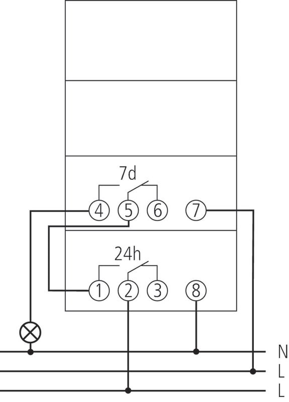 Analoginen kellokytkin, Päivä-/viikko-ohjelma ja viikonpäivien 1/2 päivää POIS PÄÄLTÄ -toiminto, 1 kanava (2 koskettimen sarjakytkentä), Aika-asettimet ja kiertosegmentit, Lyhin kytkentäaika: 45 minuuttia (12 tuntia 1/2 päivää POIS PÄÄLTÄ -toiminnolle), 6 aika-asetinta sisältyy toimitukseen, Varakäynnillä (NiMH-kenno), Kvartsiohjattu, Aika-asetin, Ruuviliittimet, Kytkentätilan näyttö, Käyntitarkastuksen näyttö