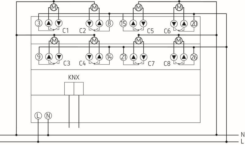 8-kanavainen verhotoimilaite FIX2, Säle- ja rullakaihtimien, auringon- ja näkösuojien, kattoluukkujen ja ilmanvaihtoluukkujen moottorien ohjaukseen, Laitteen manuaalinen käyttö (myös ilman väyläjännitettä), Kytkentätilan Ylhäällä ja Alhaalla osoitus LED-valolla jokaiselle kanavalle, Potentiaalivapaat koskettimet Ylös ja Alas jokaista kanavaa kohden, Kopiointitoiminto nopeaan parametrien siirtämiseen