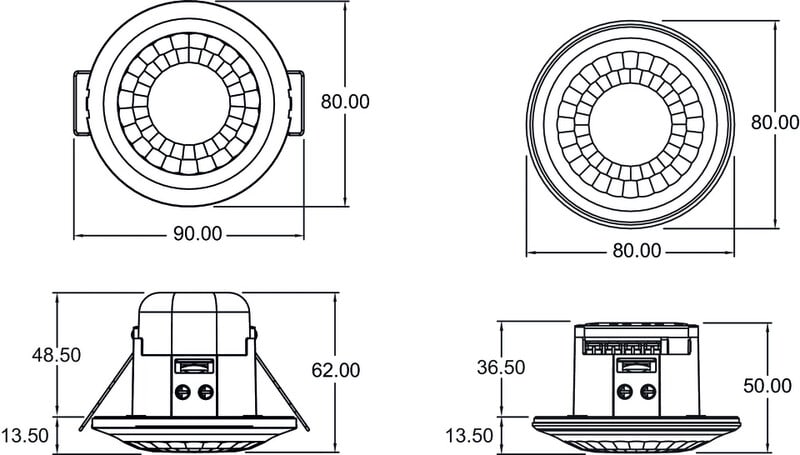 Passiivinen infrapuna-läsnäolotunnistin, Pyöreä tunnistusalue 360°, Ø 12 m (113 m2), kun asennuskorkeus 3 m, Asennus välikatto- tai uppoasennus(kojerasia) poistettavien jousien/suojakannen ja mukana toimitetun asennuskehyksen avulla, 1 valokanava (rele 230 V) ja 1 läsnäolokanava (potentiaalivapaa rele lämmityksen ja ilmastoinnin ohjaukseen), Tunnistusalueen laajennus rinnakkaiskytkennällä, enintään 8 tunnistinta voidaan kytkeä rinnakkain, yhdistäminen seinäilmaisimen theMura Slave kanssa mahdollista, Liitäntämahdollisuus painikkeille manuaalista kytkentää varten, Täysautomaattinen tai puoliautomaattinen käyttö mahdollista, Kohdistettu valoisuuden mittaus (sekavalomittaus), Opetustoiminto, impulssitoiminto, testitoiminto, porrasvalotoiminto, Tehdasasetusten ansiosta heti käyttövalmis, Arvojen ja asetusten muuttaminen potentiometreistä, kaukosäätimellä(theSenda B tai theSenda P) tai sovellusohjelman/kaukosäätimen avulla: Sovelluspohjainen kaukosäädin theSenda B, Huollon kaukosäädin theSenda P, Valinnainen käyttäjän kaukosäädin theSenda S manuaaliseen ohitukseen, Tunnistusalueen rajoitus peiteklipseillä, Sopii myös ulkoasennuksiin, asennuspaikkaa muuttamalla tunnistusalue pienenee Ø 8 m