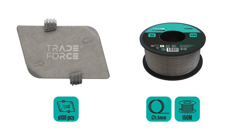 100 kpl pikalukituslaitteita + 1 vaijerikela Ø 1,5 mm, 150 m Sarja sisältää kaikki tarvittavat osat vaijeriripustukseen: 100 kpl vaijerikytkimiä ja 150 m kelan galvanoitua teräsvaijeria, jonka halkaisija on 1,5 mm ja enimmäiskuormitus 35 kg. Leikkaa vaijeri tarpeen mukaan.