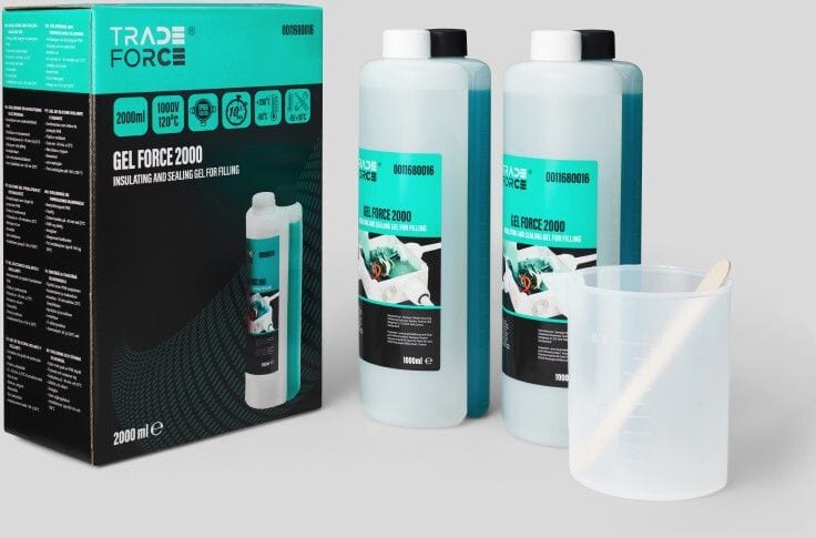 2000 ml eristysgeeliä pulloissa. Uudelleenkäytettävä, sekoita juuri senverran kuin tarvitset ja säästä loput. 2-komponenttinen, IP68,Työskentelylämpötila: -60°C / +200°C. Korvaa kaikki valuhartsit. Mukanasekoituskannu ja lasta. Ei varastointiaikaa. Kaksikomponenttinen geeli, jolla on erittäin korkeat dielektriset- ja lämpöominaisuudet, ihanteellinen liitäntäjärjestelmiin (liitoskuoret tai kotelot) virtakaapeleille. Sopiviin koteloihin valettu eristävä ja tiivistävä geeli takaa IP68-suojausluokan ja pystyy korvaamaan kaikentyyppiset hartsit. Itsepolymeerieriste kahdessa käytännöllisessä pullossa. Valamisen jälkeen eriste, jolle on ominaista erittäin alhainen viskositeetti, ympäröi ja peittää kaiken tyyppisen materiaalin, silloittuen alle 10 minuutissa. Täysin myrkytön, ristisilloittuva erittäin hidas isoterminen huippu, joka ei rasita termisesti materiaaleja, joiden kanssa se joutuu kosketuksiin. Korkean lämpötilan sovelluksiin. Nopea ristikytkentä Palautuu myös pitkien työjaksojen jälkeen. Myrkytön ja turvallinen käyttää. Ei viimeistä käyttöpäivää. Matala viskositeetti