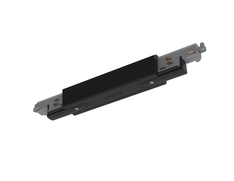 Musta Control-DALI keskisyöttörasia helppoon sähkönsyöttöön. Asennetaan nopeasti paikoilleen kosketinkiskoja yhdistämään ja mahdollistamaan sähkönsyöttö seuraavaan kiskoon.