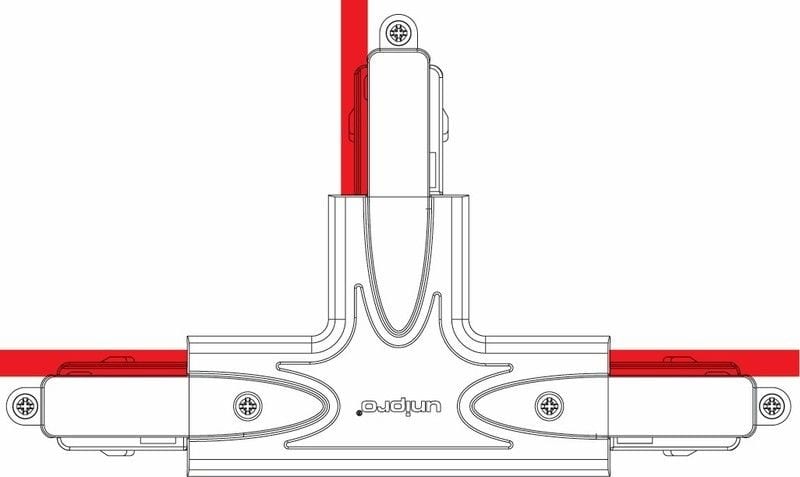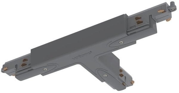 Harmaa Control-DALI T-kappale nopeisiin kosketinkiskojen jatkoihin ja yhdistämisiin. T-kappaleessa on sähkönsyöttömahdollisuus, maadoitus A.