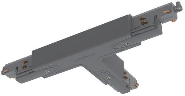Harmaa Control-DALI T-kappale nopeisiin kosketinkiskojen jatkoihin ja yhdistämisiin. T-kappaleessa on sähkönsyöttömahdollisuus, maadoitus D.