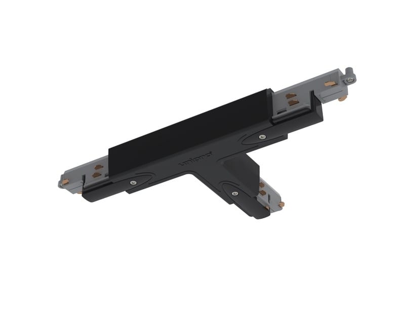 Musta Control-DALI T-kappale nopeisiin kosketinkiskojen jatkoihin ja yhdistämisiin. T-kappaleessa on sähkönsyöttömahdollisuus, maadoitus A.