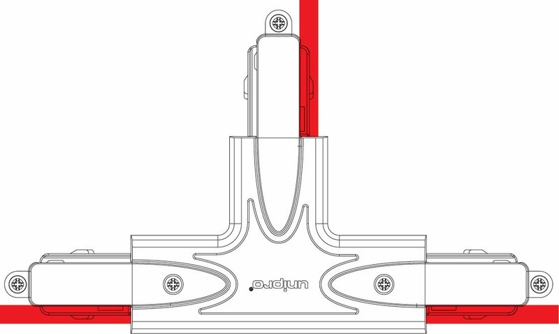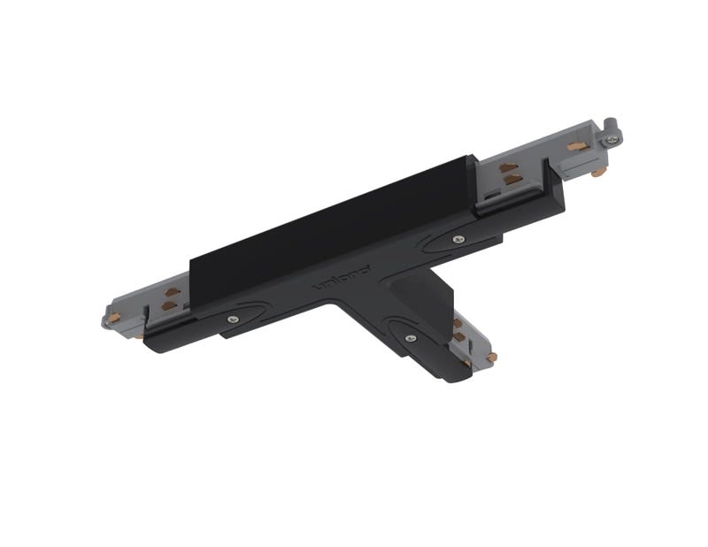 Musta Control-DALI T-kappale nopeisiin kosketinkiskojen jatkoihin ja yhdistämisiin. T-kappaleessa on sähkönsyöttömahdollisuus, maadoitus D.