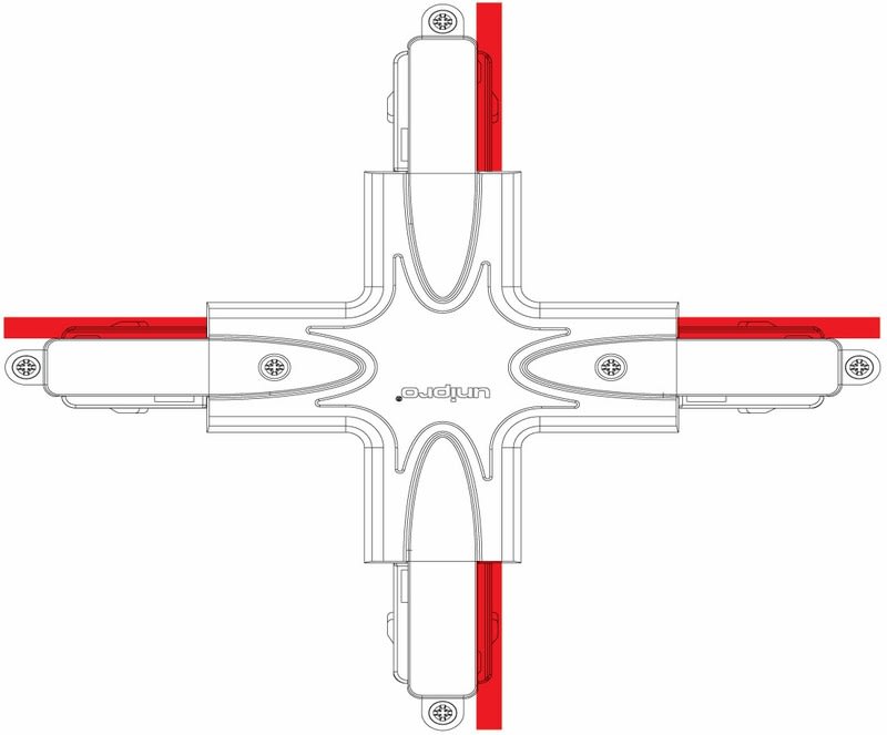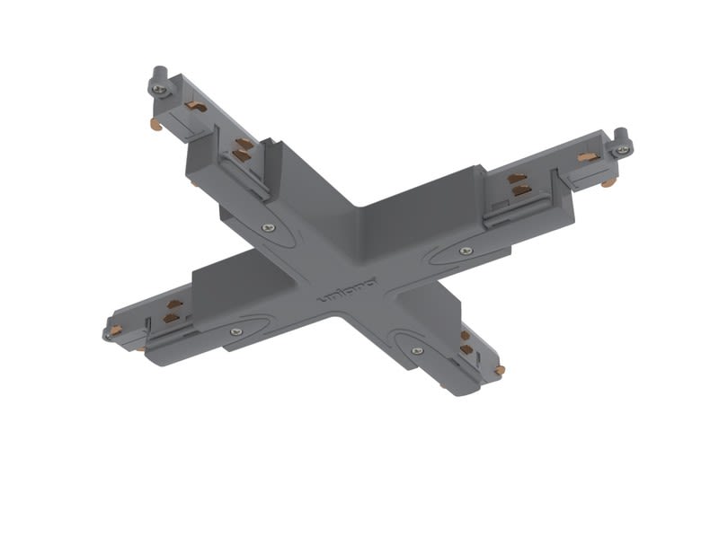Control-DALI X-kappale sujuviin kosketinkiskojen yhdistämisiin. X-kappaleessa on sähkönsyöttömahdollisuus. Harmaana yhdistää harmaat kiskot kauniisti ja on siisti jokaista taustaa vasten.