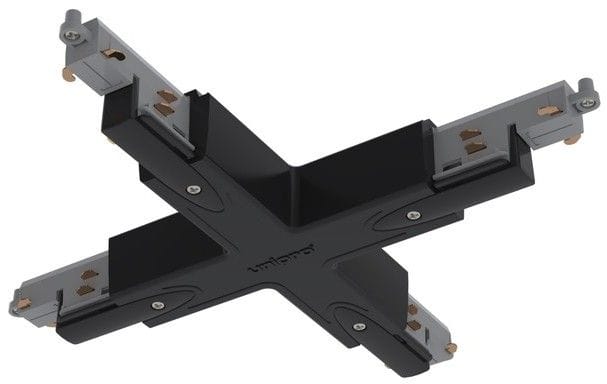 Control-DALI X-kappale sujuviin kosketinkiskojen yhdistämisiin. X-kappaleessa on sähkönsyöttömahdollisuus. Mustana yhdistää tummat kiskot kauniisti ja on upeannäköinen asennus jokaista taustaa vasten.