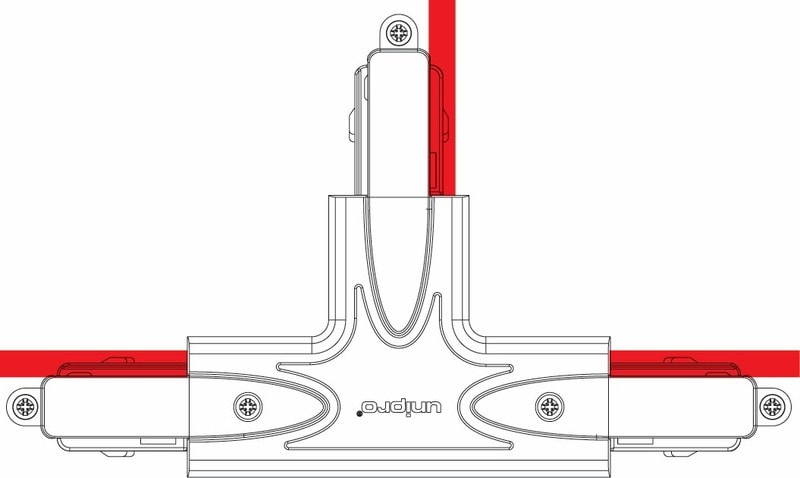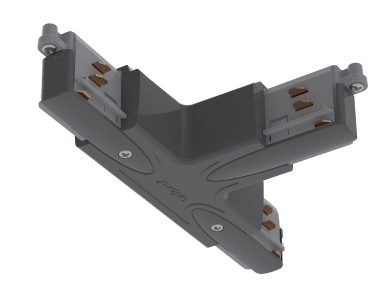 Harmaa T-kappale nopeisiin kosketinkiskojen jatkoihin ja yhdistämisiin. T-kappaleessa on sähkönsyöttömahdollisuus, maadoitus B.