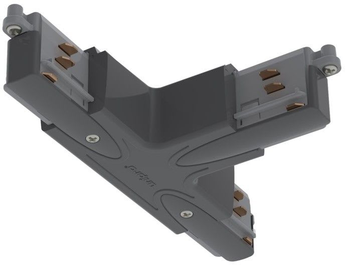 Harmaa T-kappale nopeisiin kosketinkiskojen jatkoihin ja yhdistämisiin. T-kappaleessa on sähkönsyöttömahdollisuus, maadoitus D.
