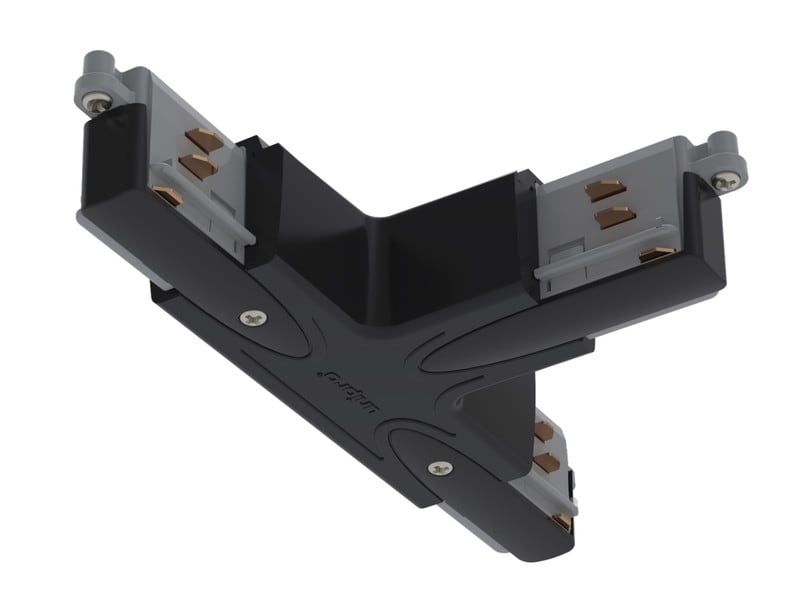 Musta T-kappale nopeisiin kosketinkiskojen jatkoihin ja yhdistämisiin. T-kappaleessa on sähkönsyöttömahdollisuus, maadoitus B.