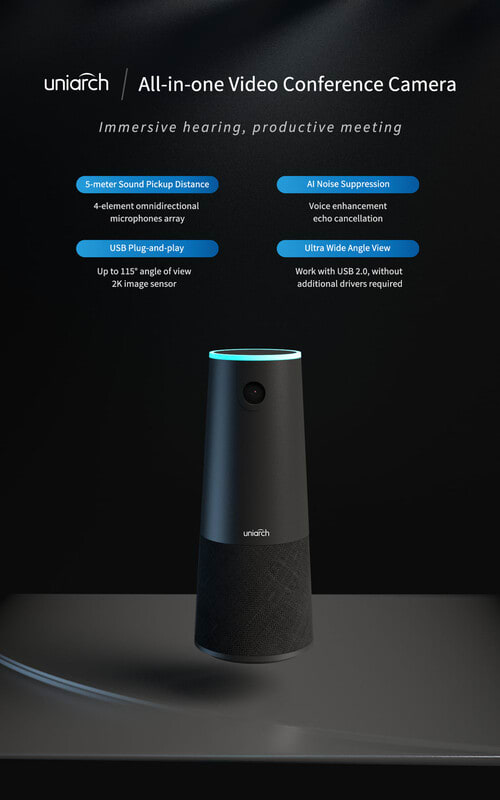 UNV:n IOT-UNEAR-A30-50HZ on uskomattoman yksinkertainen ratkaisu pienempien tilojen videoneuvotteluihin. USB-kaapeli kiinni ja olet valmis aloittamaan Teamsin hyvälaatuisen äänen ja videokuvan kanssa. Laite on yhteensopiva johtavien online-konferenssialustojen kanssa.