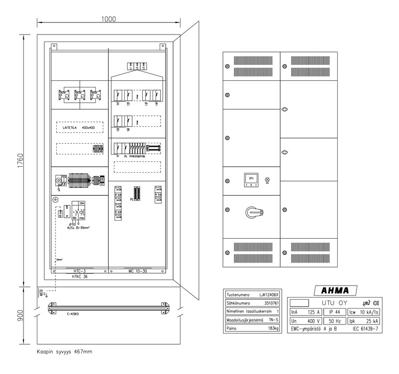 Suojakaapin materiaalina on maalattu teräs (väri RAL 7024) ja ovessa on kolmipistesalpa lukitusmahdollisuudella. Katolle on sijoitettu nostokorvat. Kaapin kyljissä sijaitsevat tuuletusritilät. Huom! Jalusta tilattava erikseen (soveltuva jalusta JAL1000 3500689).