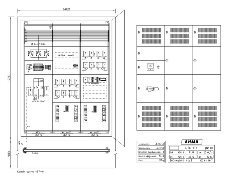 Suojakaapin materiaalina on maalattu teräs (väri RAL 7024) ja ovessa on kolmipistesalpa lukitusmahdollisuudella. Katolle on sijoitettu nostokorvat. Kaapin kyljissä sijaitsevat tuuletusritilät. Huom! Jalusta tilattava erikseen (soveltuva jalusta JAL1400 3500691).