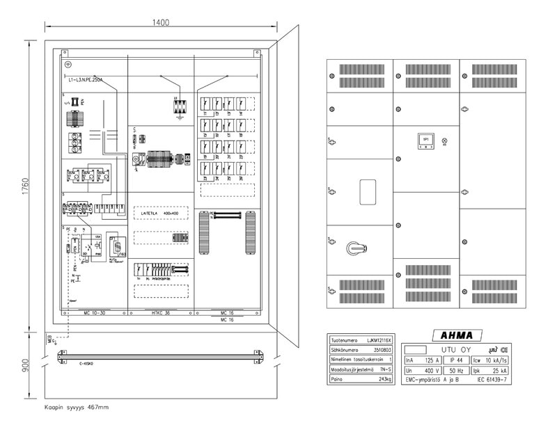 Suojakaapin materiaalina on maalattu teräs (väri RAL 7024) ja ovessa on kolmipistesalpa lukitusmahdollisuudella. Katolle on sijoitettu nostokorvat. Kaapin kyljissä sijaitsevat tuuletusritilät. Huom! Jalusta tilattava erikseen (soveltuva jalusta JAL1400 3500691).