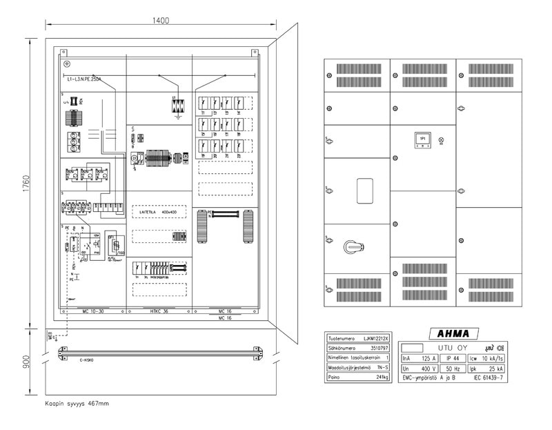 Suojakaapin materiaalina on maalattu teräs (väri RAL 7024) ja ovessa on kolmipistesalpa lukitusmahdollisuudella. Katolle on sijoitettu nostokorvat. Kaapin kyljissä sijaitsevat tuuletusritilät. Huom! Jalusta tilattava erikseen (soveltuva jalusta JAL1400 3500691).