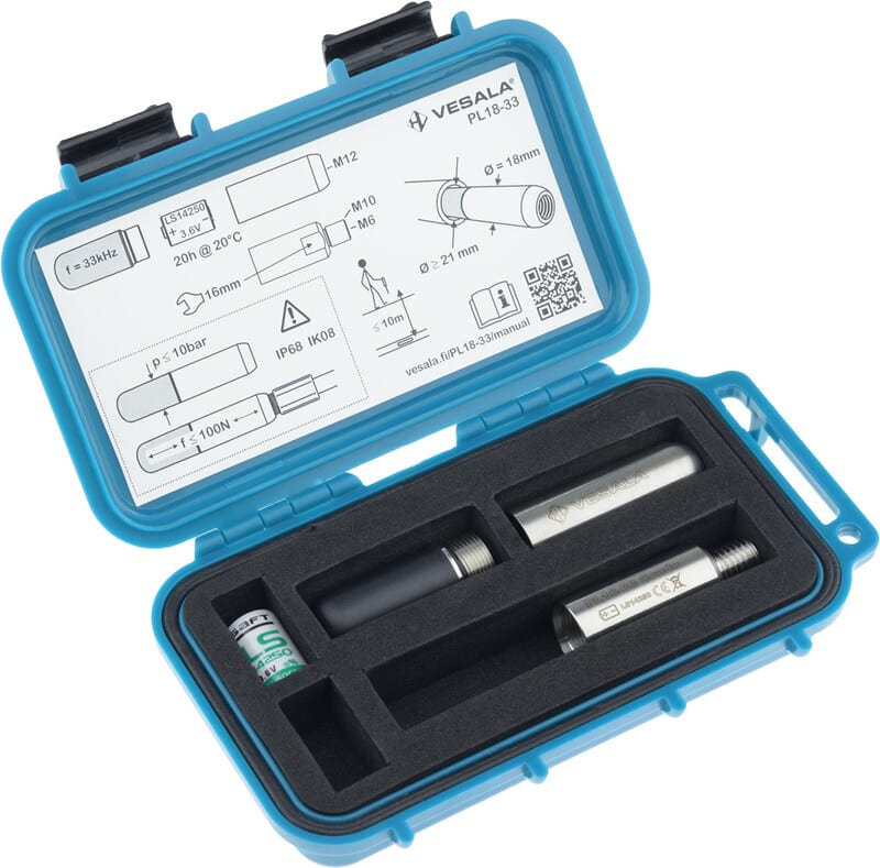 Peruskokoonpano sisältää PL18-33 lähettimen, M12/M6-sisäkierteillä sekä M10-ulkokierteellä varustetut paristotilat (yhteispituus 85mm), 3,6V litiumpariston, muovisen säilytysrasian (160 x 95 x 30mm) ja pikakäyttöohjeen.