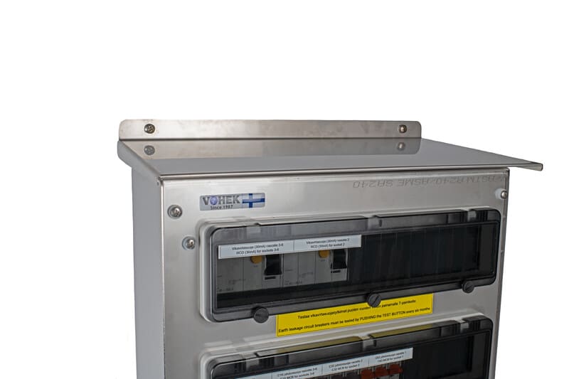 KOVA pistorasiakeskuksen suojakatto. Suojakatto on valmistettu hapon kestävästä teräksestä ja näin ollen soveltuu vaativiin olosuhteisiin suojaamaan KOVA pistorasiakeskusta.