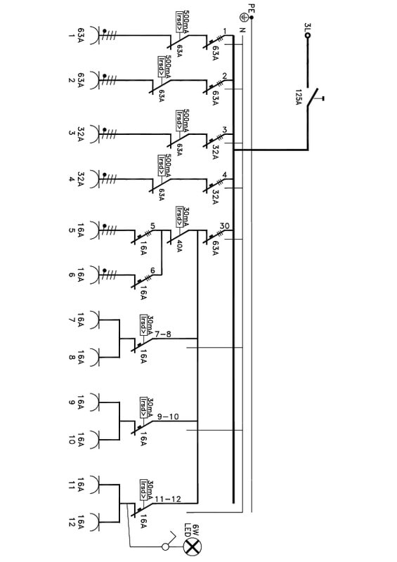 16A pistorasiat suojattu 30mA vikavirtasuojilla, muut rasiat suojattu 500mA vikavirtasuojalla.