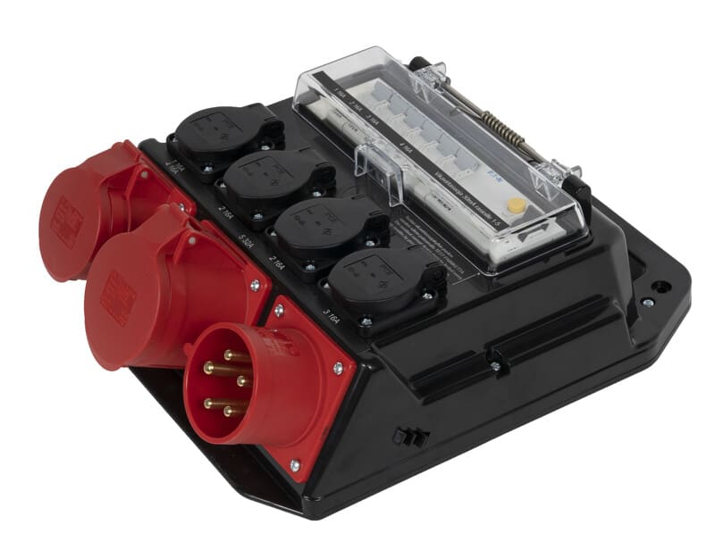 Valmistettu iskunkestävästä kestomuovista. Itsestään sulkeutuva peltinen varokkeiden suojakansi. Varustettu kantokahvalla ja kiinnitysrei’illä. Pistorasiat on suojattu C-ominaiskäyrän suojakatkaisimilla.
