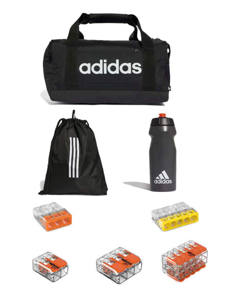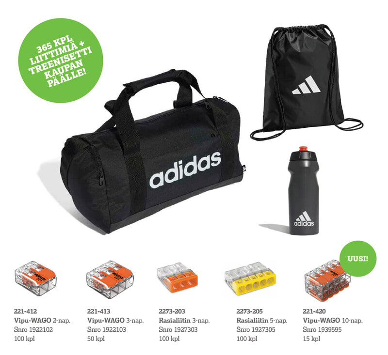 221-412 100 kpl, 221-413 50 kpl, 221-420 15 kpl, 2273-203 100 kpl, 2273-205 100 kpl ja Adidaksen treenikassi, juomapullo ja treenipussi