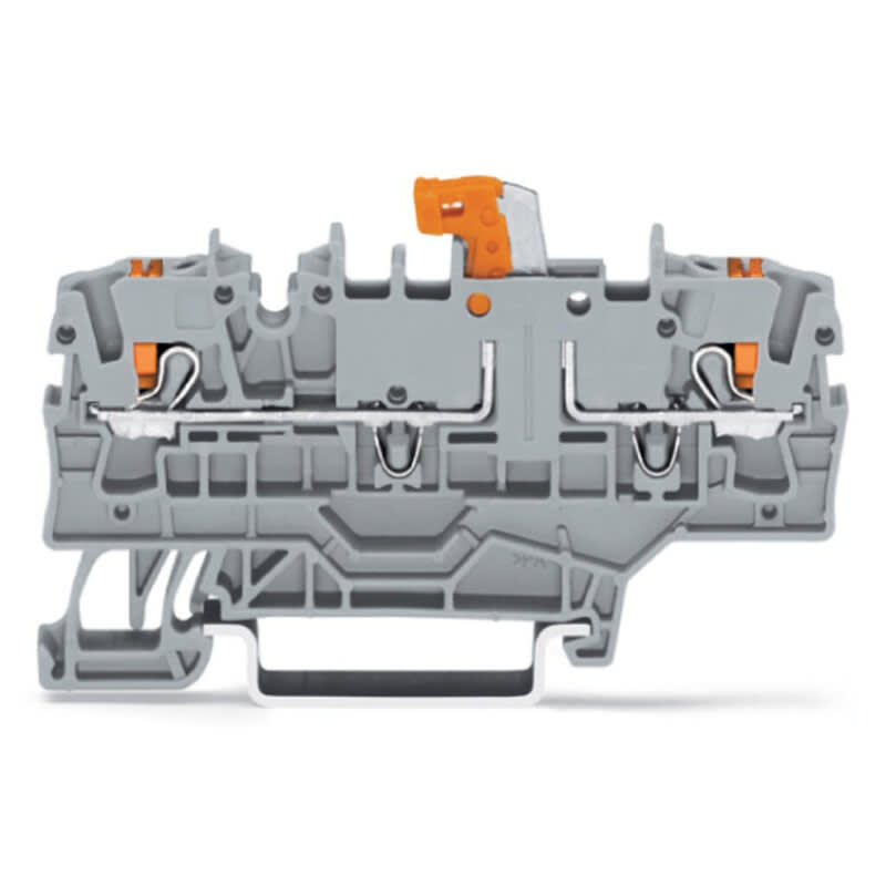 Painonapilla 2-Nap, 3-oikosiltapaikkaa, katkaistava riviliitin koestustarkoituksiin, HARMAA, 400V/kV/3, In 16 A, liitinleveys 5.2 mm, AWG 22-12