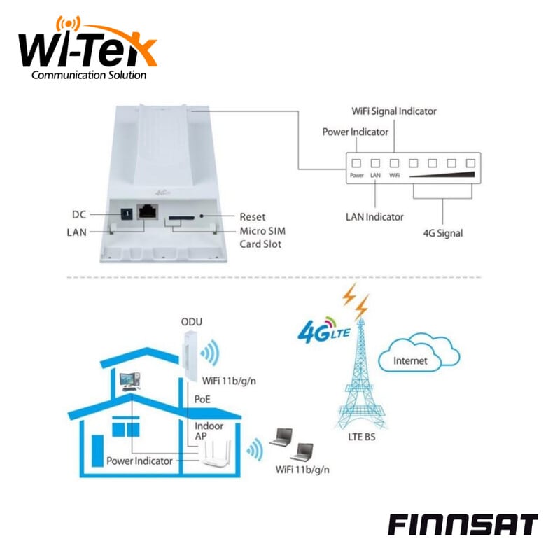 Wi-Tek WI-LTE110-O on ulos asennettava 4G-mobiilireititin. Muuntaa 4G-signaalin langalliseksi ja langattomaksi verkoksi.
