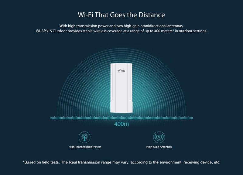 - 3*5dB sisäinen ympärisäteilevä antenni, 500 mW lähetysteholla ja langattomalla LOS-peittoalueella kantaa jopa 400 metrin etäisyyteen