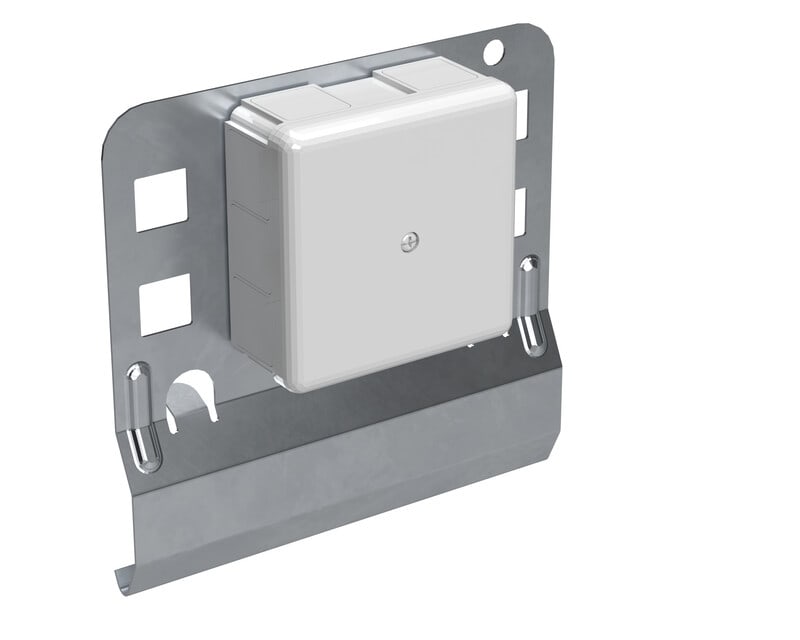 Jakorasiallinen asennuslevy asennetaan tikashyllyn reunaan ylä- tai alasuuntaan. Lukittuu ns. lukituskielekkeillä. Kojerasia IP65UP.