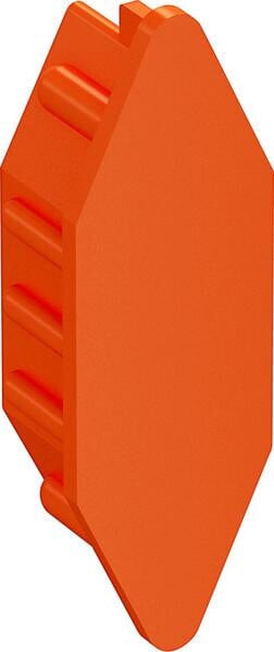 Oranssi tikashyllyn päätykappale sulkee ja suojaa hyllyn sivupienan. Työnnetään sivupienan sisään.