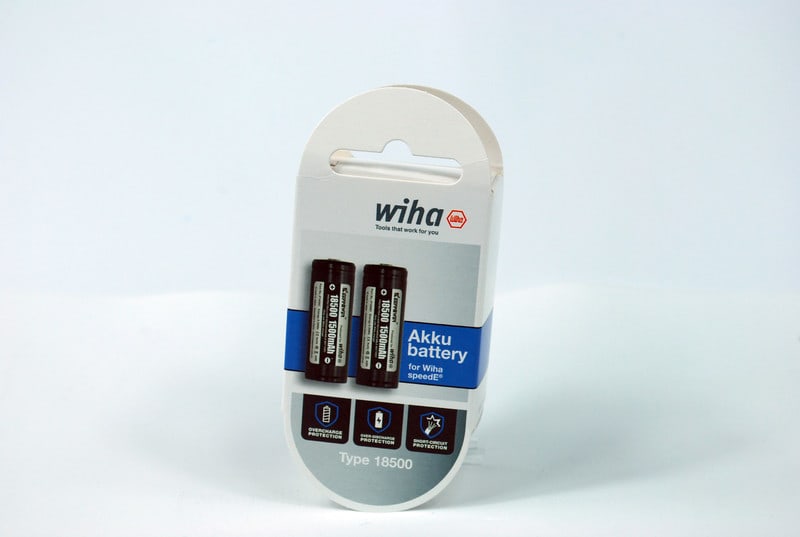 Setti sisältää kaksi litiumioniakkua akkuavusteisessa speedE®-ruuvimeisselissä käytettäväksi. Sopivat myös Wiha-taskulampun virranlähteeksi. Erityisen suojakytkennän ansiosta akut ovat suojatut ylilatautumiselta, syväpurkautumiselta, ylivirralta ja oikosululta. Akun nimellisjännite 3,7 V, kapasiteetti 1,5 Ah, yksi kenno. Tyyppi 18500 1500 mAh / 5,55 Wh